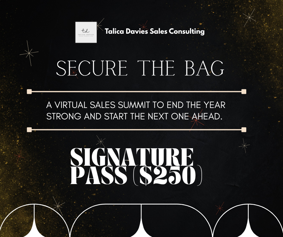 The Signature Pass includes a 30-minute 1:1 with Talica to personalize your Q4 sales plan, define your 3 core sales tenets, and review your weekly sales rhythm you can execute immediately.